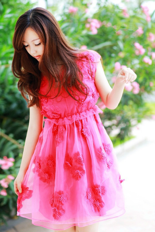 Jetzt komme ich zurück!:) Der Frühling ist wirklich gekommen. Ich liebe diese Jahreszeit, die schöne Blumen blühen und die Sonne lacht.:)) Wenn ich dies aussehe, fühle ich mich richtig fröhlich und glücklich. Huhu, ich meine den süßen Rock in hellen Farben, wie Pink, Rot, Orange verpasst ihr nicht. Heute zeige ich euch mein süßes pink Kleid, wie die oben Bilder gezeigt werden. Die Blumen auf diesem Kleid gefallen mir gut. Es ist aus Tüll und Chiffon. Fließend und zarter. :)